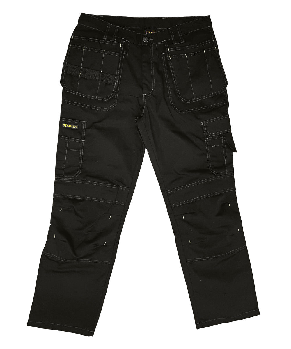 Stanley Huntsville are tough work trousers with holster, kneepad and multiple pockets for added storage. Classic fit with gripper print inner waistband and angled centre belt loop ensuring a quality fit. Triple-needle back rise, cargo side pockets, kneepad pockets together with cut and sew reinforced hem panels.